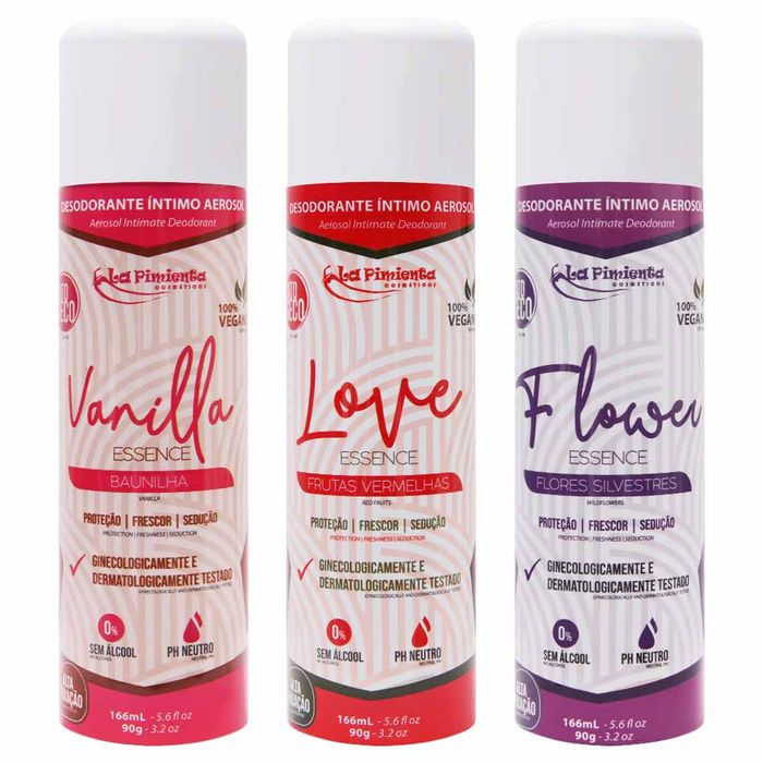 Desodorante íntimo Essence aerossol com jato seco e alta fixação, versão Love (Notas de Frutas Vermelhas), Flower (Notas de Flores Silvestres) e Vanilla (Notas de Baunilha). Dermatologicamente e ginecologicamente testado. Inspirada em essências impactantes, marcantes e desejadas, para quem busca marcar presença de maneira ousada, delicada, elegante, sensual e com muita originalidade. Desenvolvido com ativos exclusivos, possui jato seco que deixa a área aplicada com sensação de bem-estar e limpeza, oferecendo frescor imediato e ação prolongada de alta fixação, mantendo a região super perfumada por muito mais tempo. Previne e protege contra possíveis odores nas partes íntimas, afim de acabar com os desconfortos gerados no dia a dia e principalmente nas relações sexuais, tornando-se um aliado para complementar o cuidado pessoal e aumentar a intimidade entre os casais. Suaviza, renova e hidrata a pele com um toque seco e aveludado. Sua tecnologia tem uma formulação que contribui para diminuição da produção de suor e transpiração excessiva. Ideal para ser usado em ocasiões que o cuidado precisa ser prático e rápido. Uma bela alternativa para quem não tem tempo e busca praticidade, inovação e ousadia!